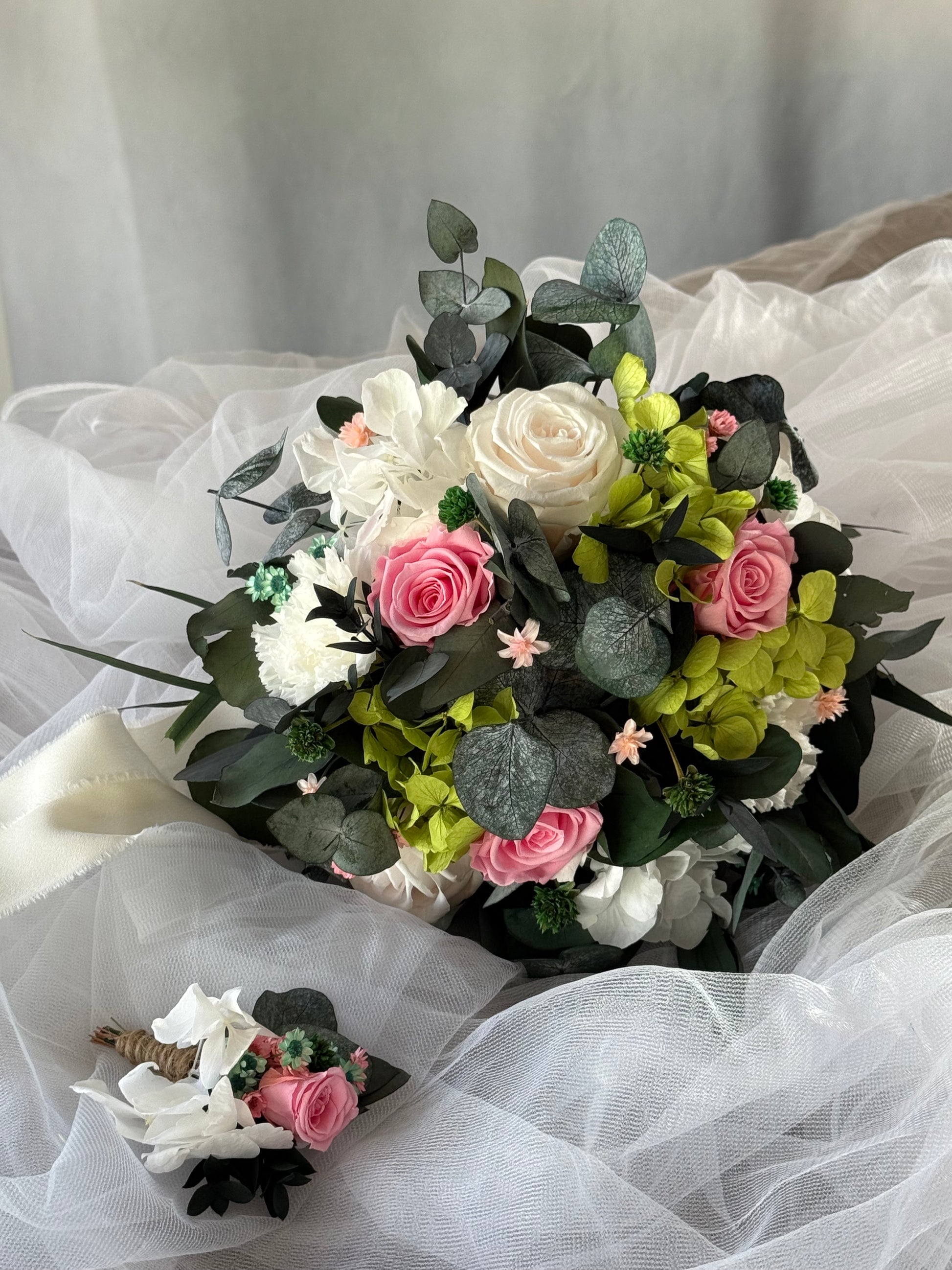If you would like additional options, such as a replica, a bridesmaid bouquet, a wreath, a bracelet, a hairpin, additional boutonnieres, or a wedding table centerpiece, please contact us. We will help you realize all your wishes.