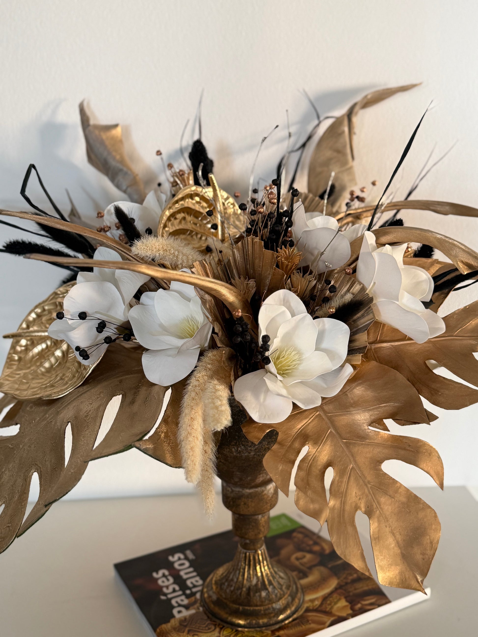 El ramo está compuesto por varios tipos de hojas de palma en tonos dorados, junto con una magnolia blanca como la nieve. Se añaden flores secas en blanco, negro y dorado para aportar encanto y ligereza.