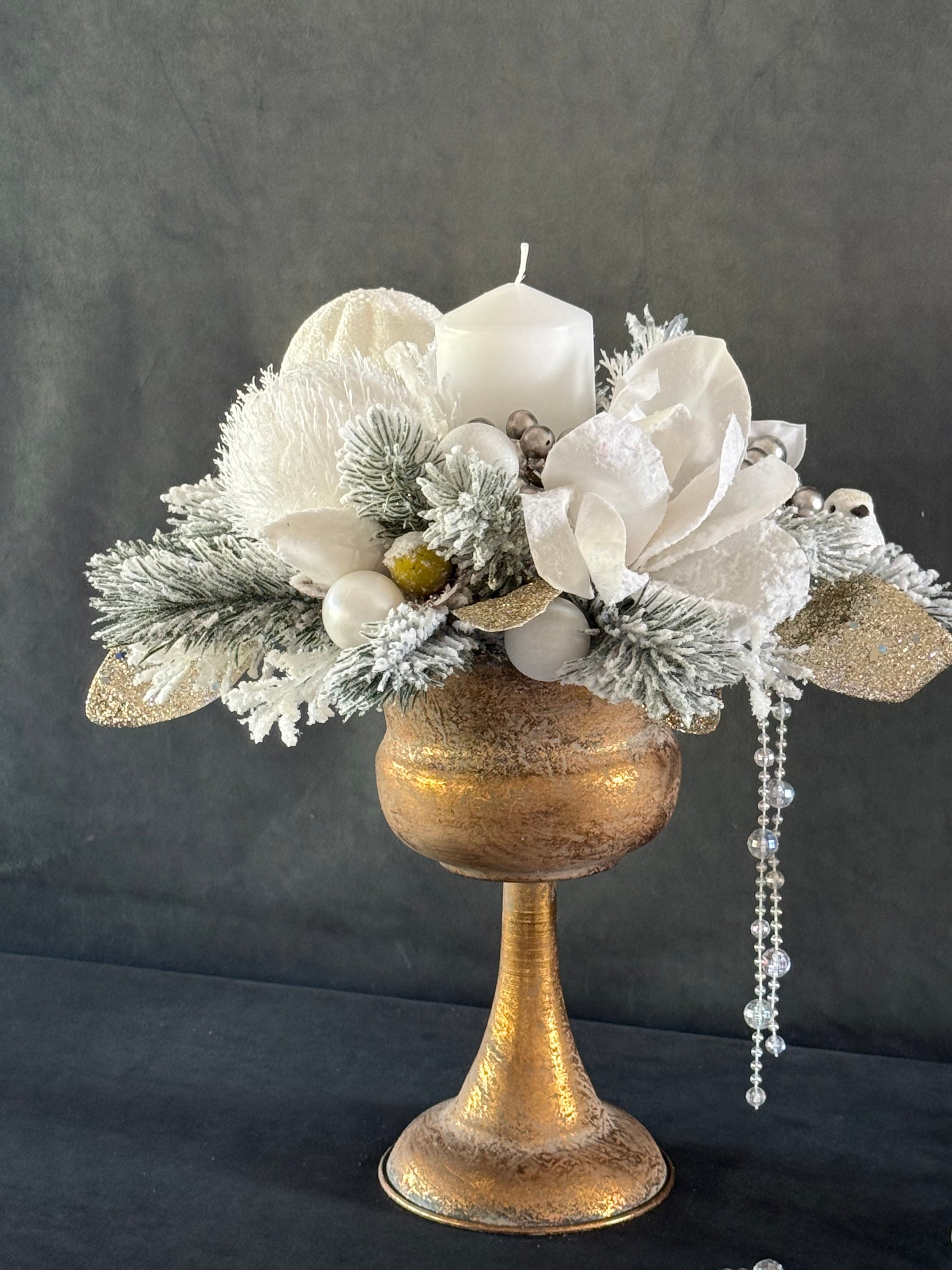 Sesil, Christmas table decor. A magnificent Christmas arrangement in a chic gold metal vase with an aged effect. The decor is done in white tones, with beautiful white baubles, white orchids, fir branches, beads, and a beautiful white bird. The arrangement is adorned with a large white candle. This striking, stylish arrangement will add a touch of chic to your interior and enhance your Christmas eve. Bring feeling into any house. Gorgeous and versitile will serve for many years. Ideal for home, office decoration. Perfect gift idea for anyone!