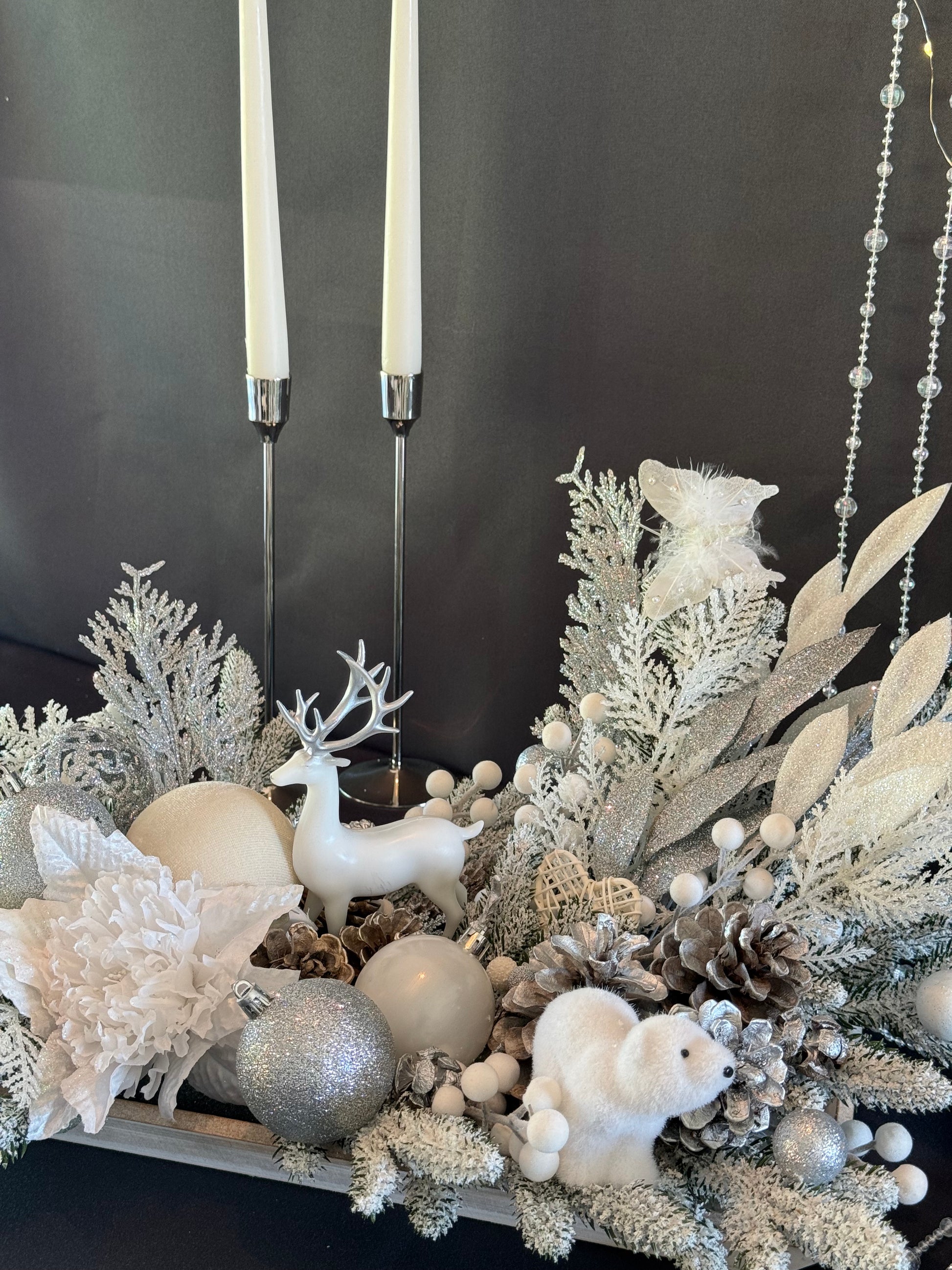 Kukunosha, Christmas table decoration. Christmas decor on white wooden tray decorated with artificial fir branches, white and gold twigs and leaves, white and silver Christmas decor with reindeer, teddy bear and bird. Bring Christmas feeling into any house. Gorgeous and versitile will serve for many years. Ideal for home, office decoration. Perfect gift idea for anyone!