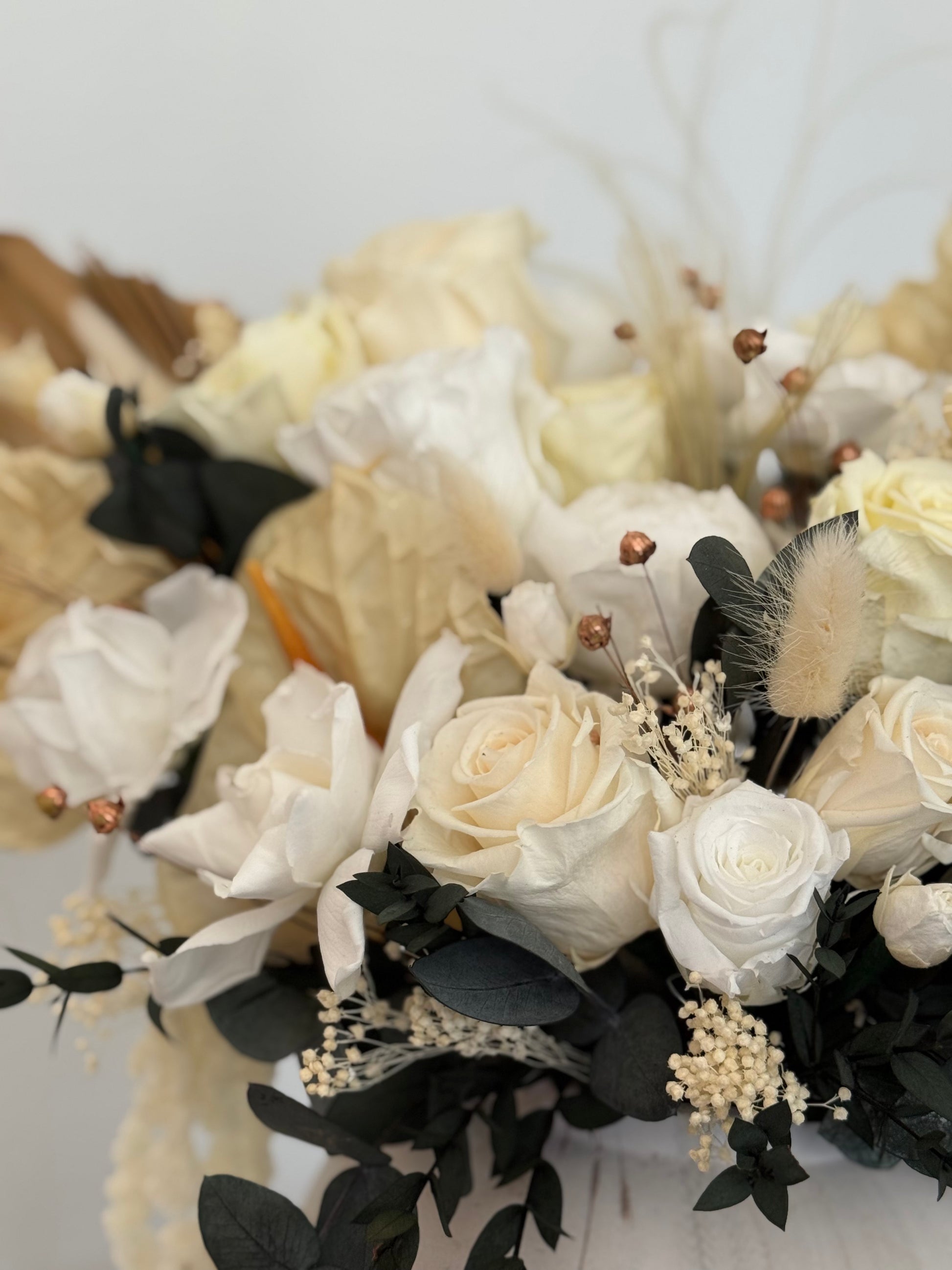 Un fantástico arreglo floral de flores preservadas blancas y crema con eucalipto verde, ramas de amaranto, anturio y hojas de palma.