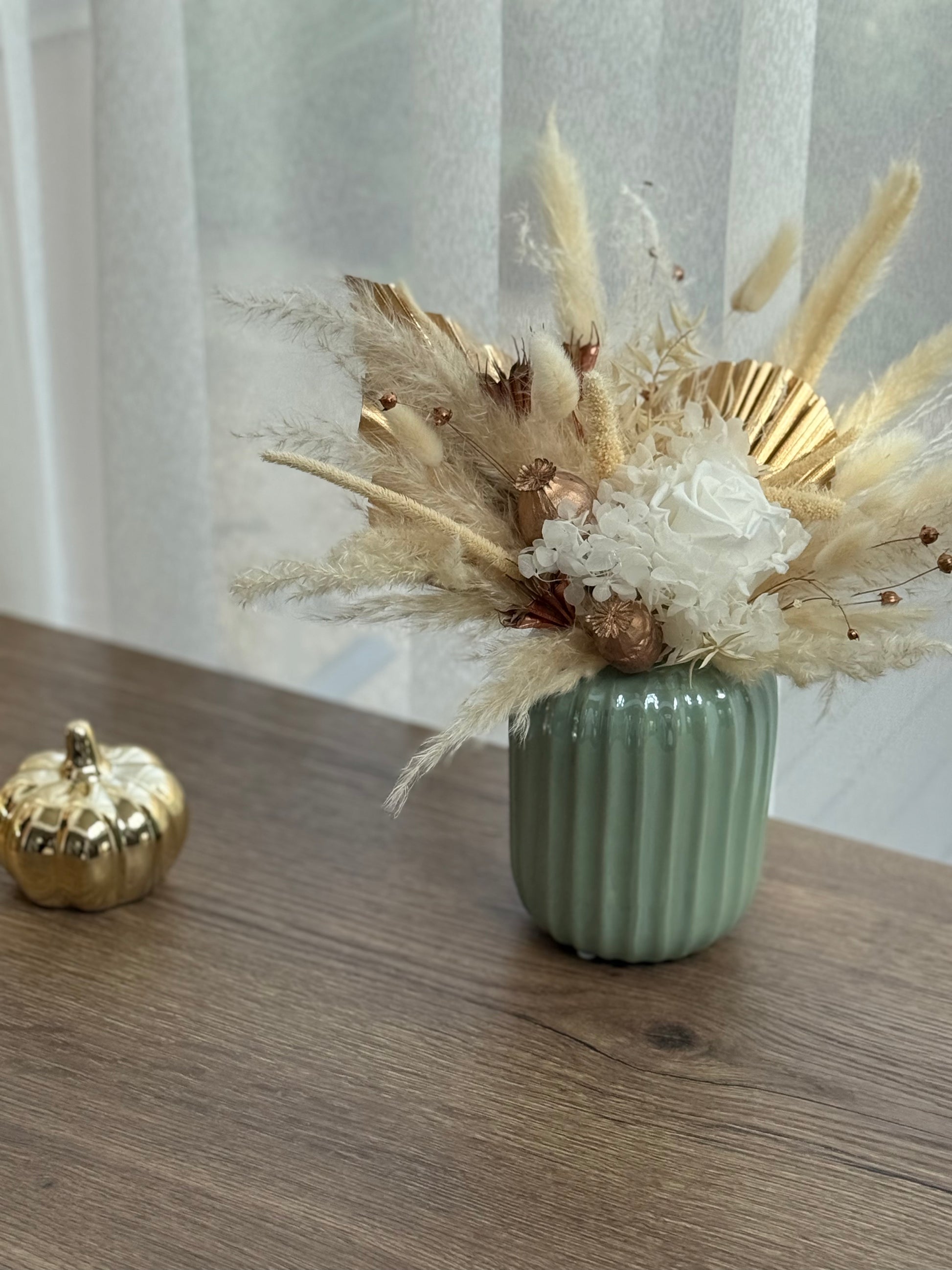 Alumine is a refined, handcrafted floral arrangement featuring elegantly paired with delicate cream tones, white rose and white hidrangea, golden palm leavs and pamoas grass. Designed to bring a sense of beauty, tenderness and special style, this piece enhances any interior with its timeless beauty. Each creation is one-of-a-kind, making it truly special.