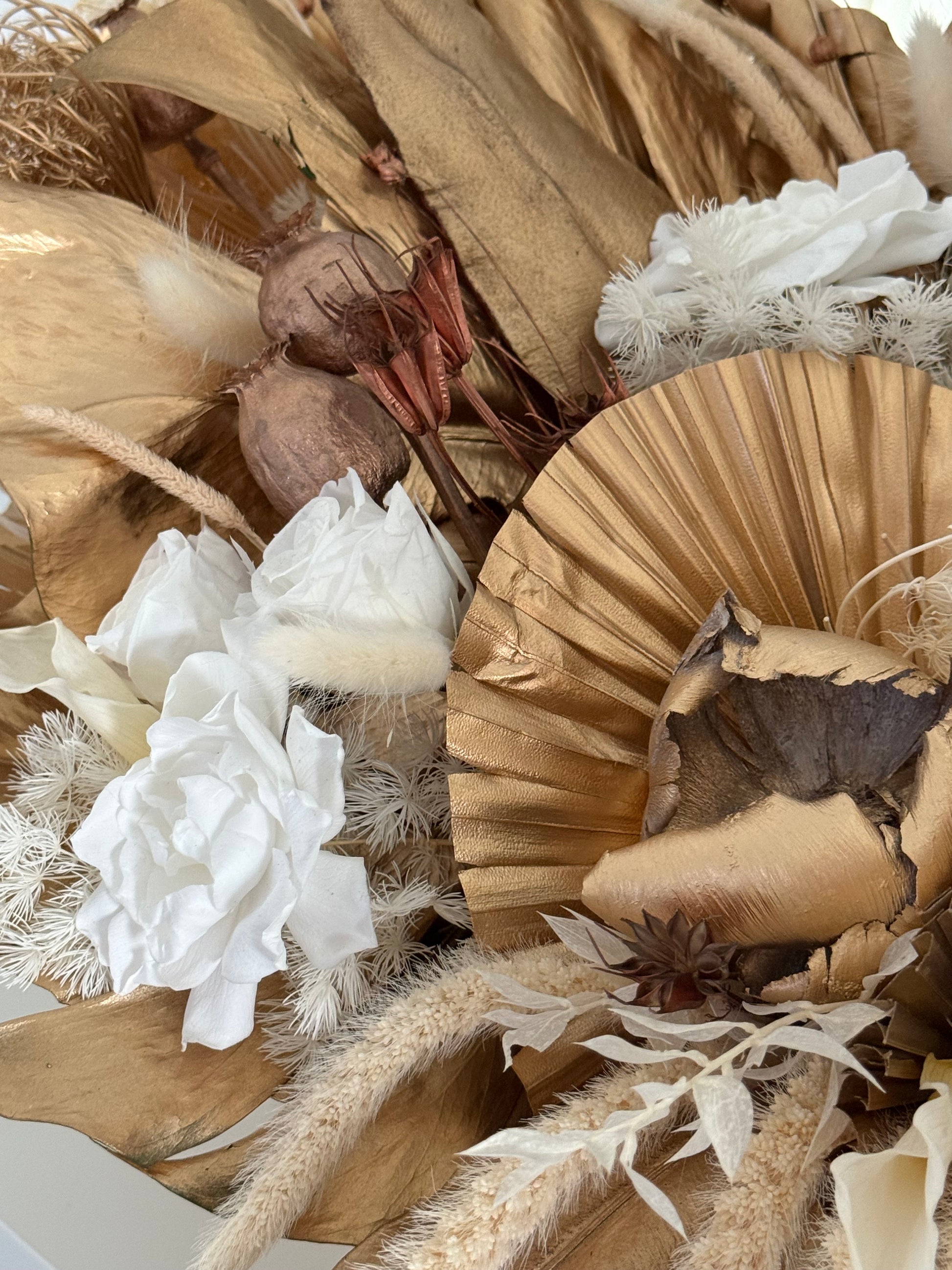 Un lujoso arreglo floral de flores preservadas. El arreglo está compuesto por hojas de palma y otras hojas secas doradas, con flores blancas secas y flores blancas como la nieve: impresionantes rosas blancas, alcatraces y jazmines. El arreglo se presenta en un hermoso jarrón dorado, que complementa a la perfección este ramo. Este lujoso arreglo añadirá un toque de lujo a cualquier interior.