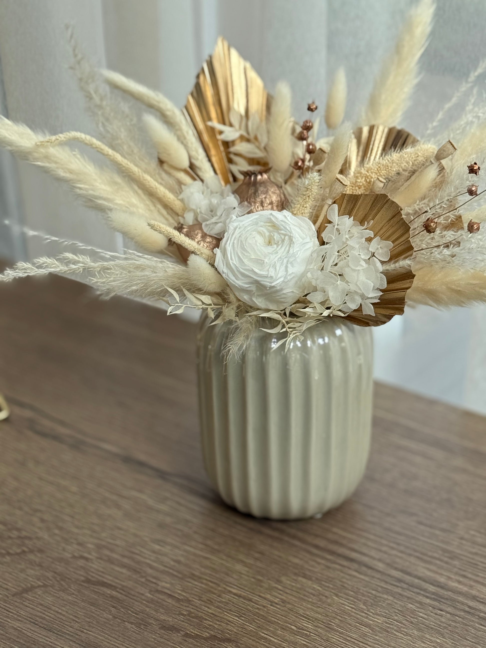Abrau is a refined, handcrafted floral arrangement featuring elegantly paired with delicate cream tones, white rose and white hidrangea, golden palm leavs and pamoas grass. Designed to bring a sense of beauty, tenderness and special style, this piece enhances any interior with its timeless beauty. Each creation is one-of-a-kind, making it truly special.