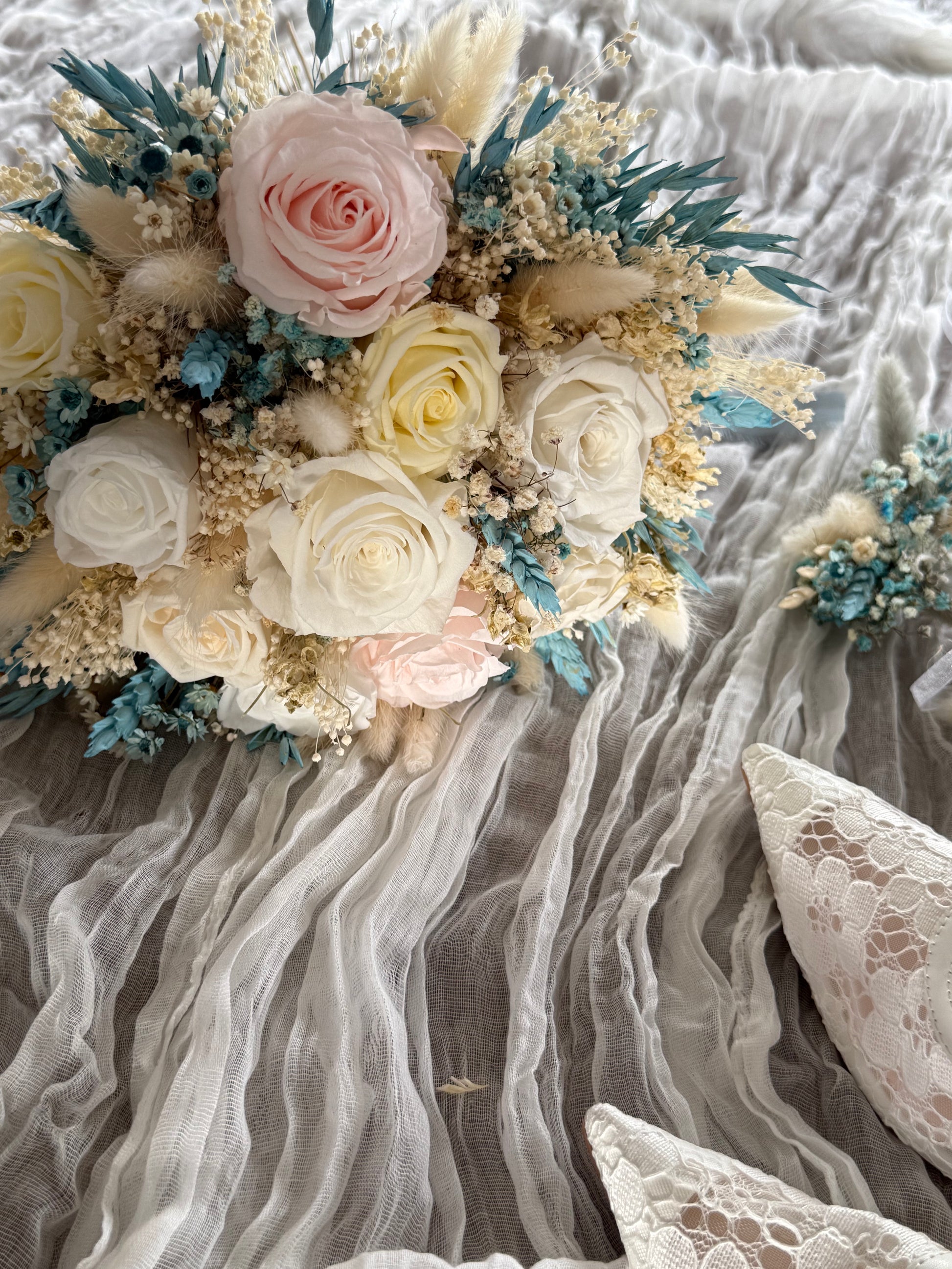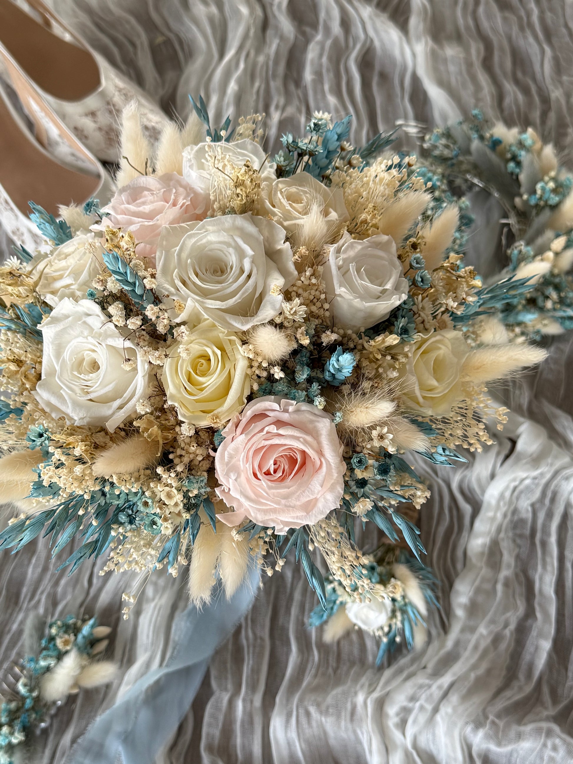 Realza tu día especial con el ramo de novia Vargato. Con delicadas flores blancas y rosas , y un toque de eucalipto verde. Irradiando lujo y clase , este ramo añadirá un toque de prestigio a tu conjunto nupcial. Una elección elegante para la novia sofisticada.