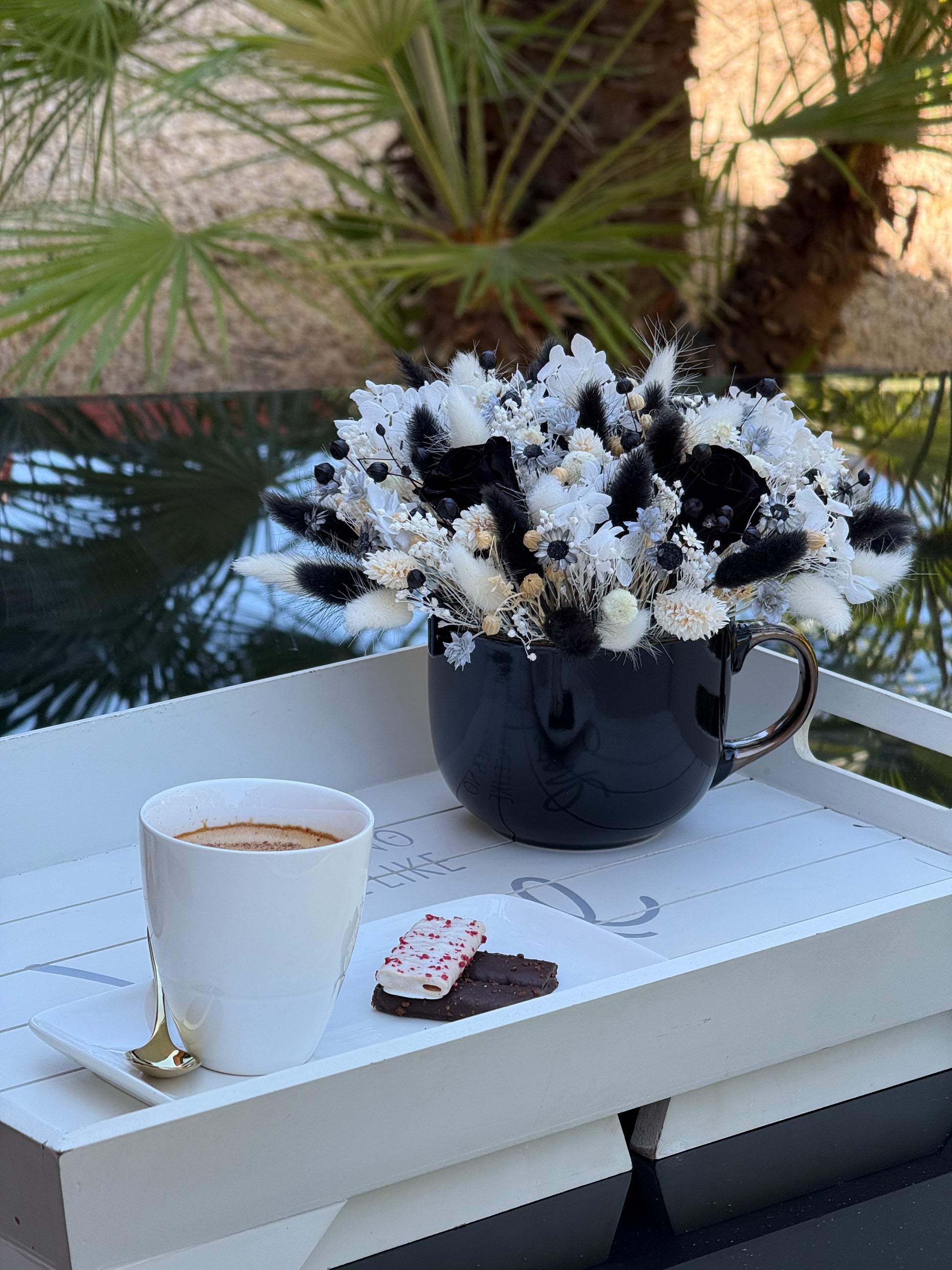 Mono is a refined, handcrafted floral arrangement featuring elegantly paired with white, black and gray flowers. Designed to bring a sense of beauty, tenderness and special style, this piece enhances any interior with its timeless beauty. Each creation is one-of-a-kind, making it truly special.