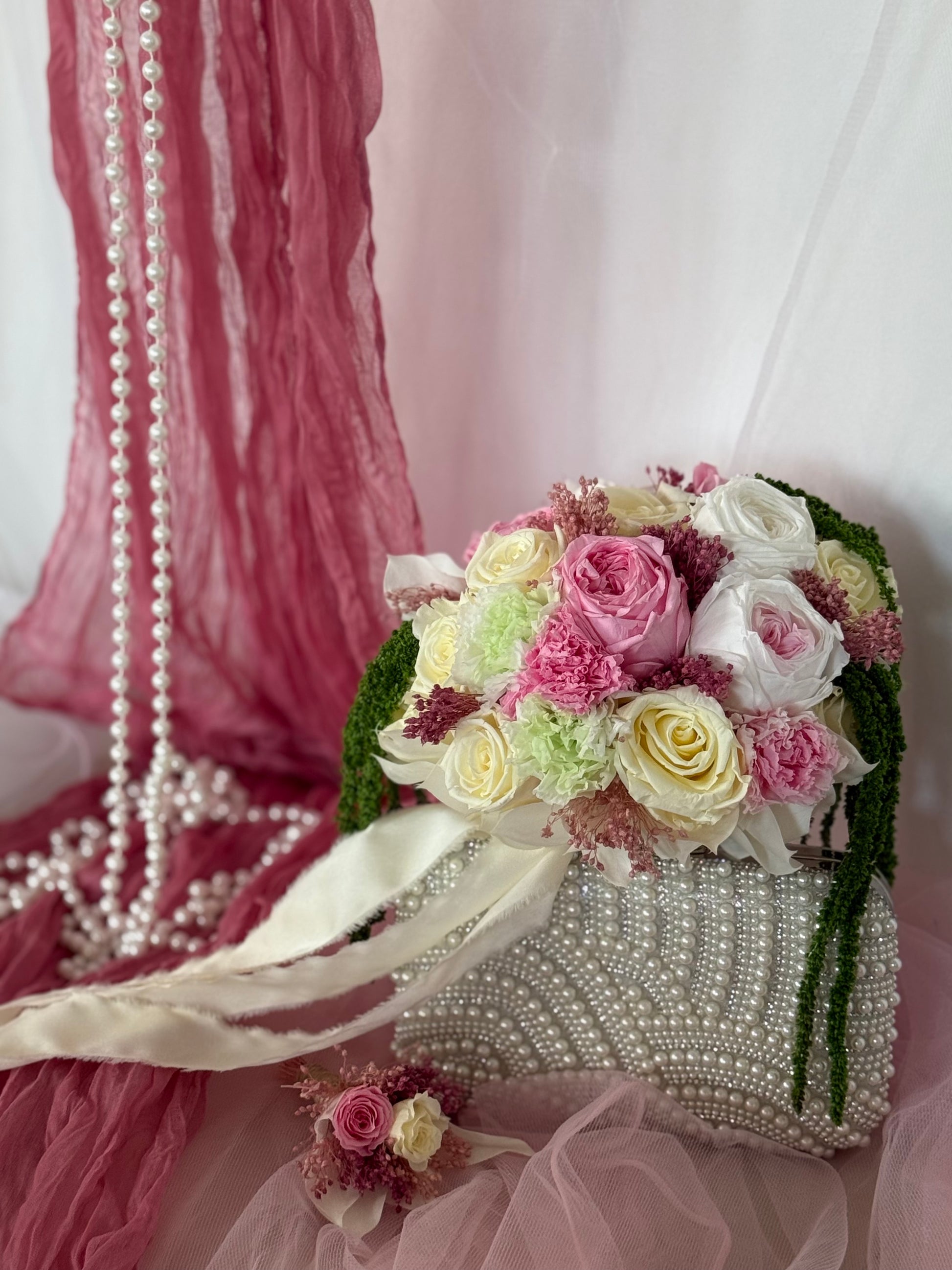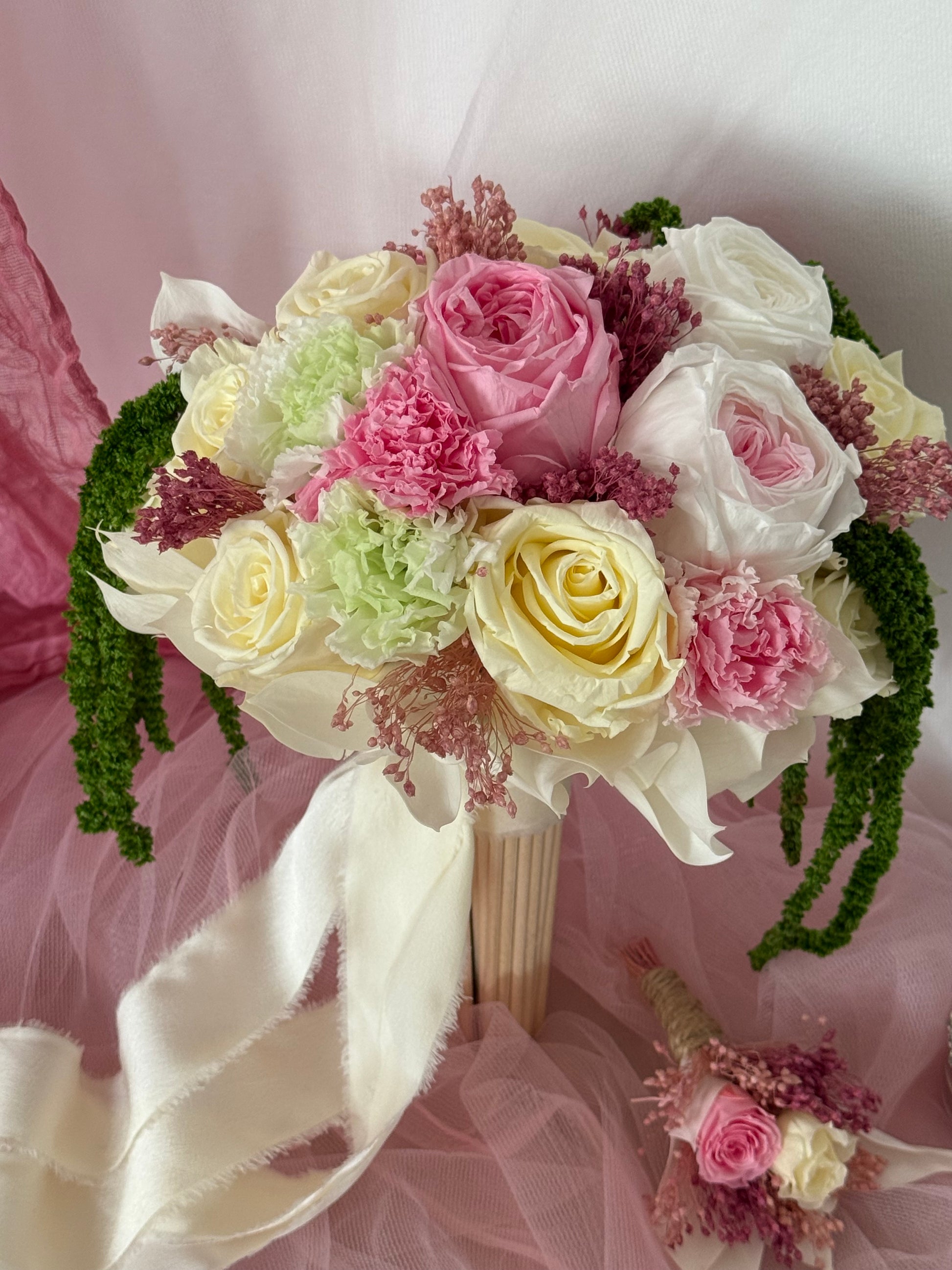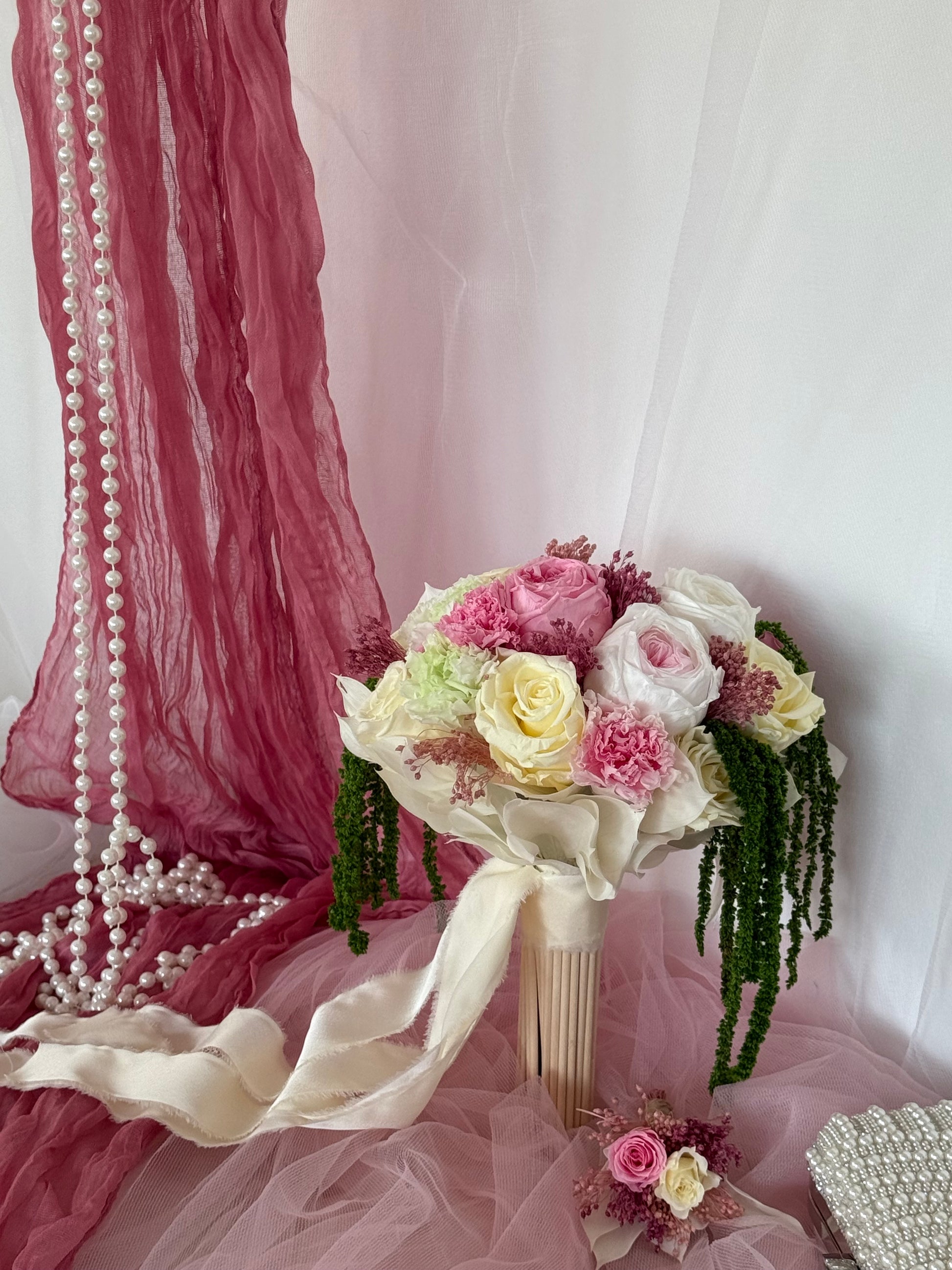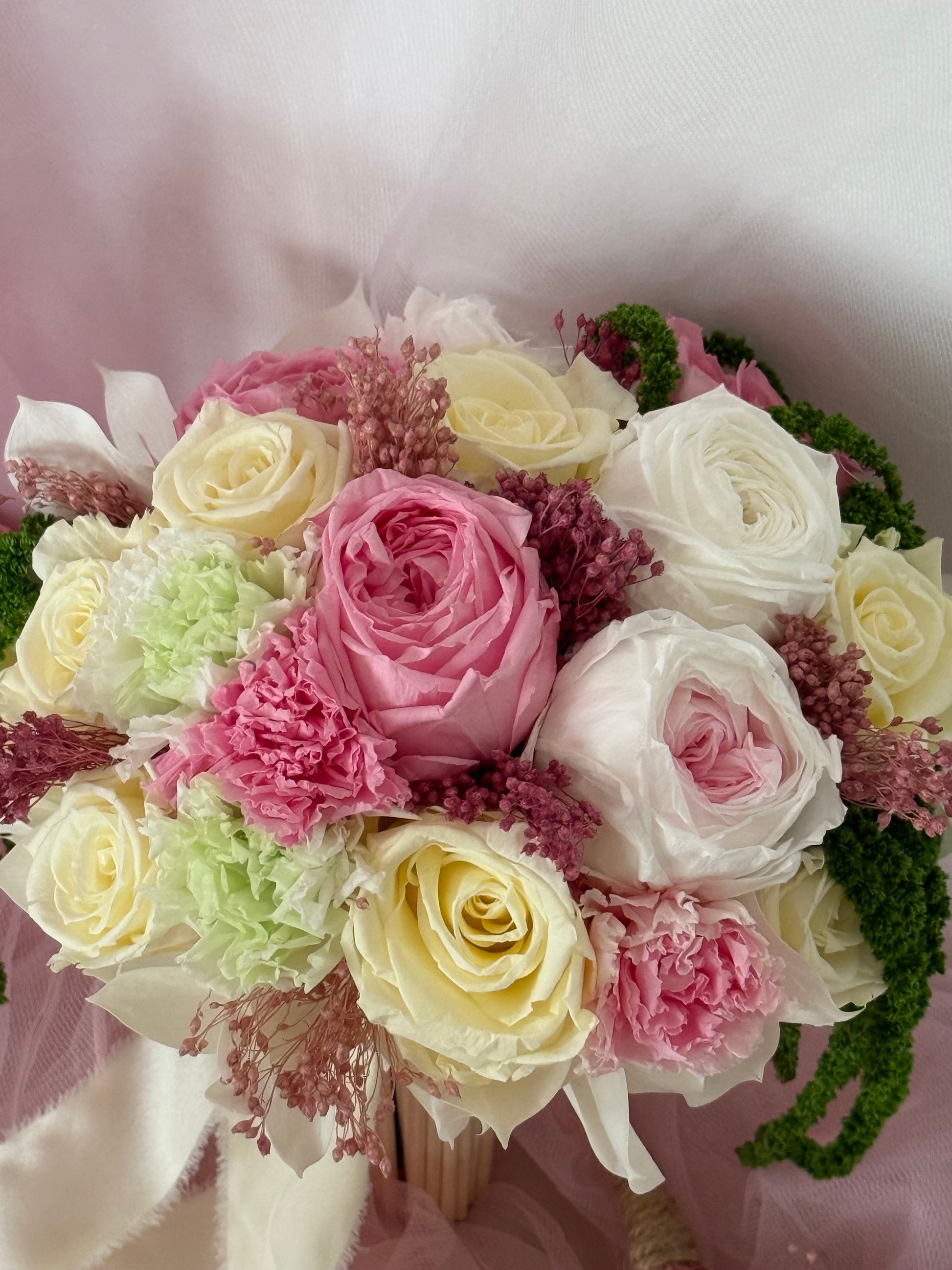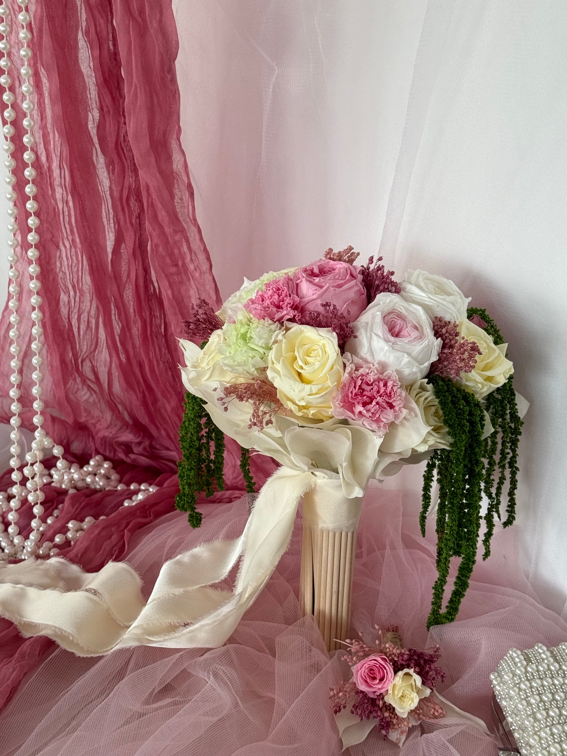 Realza tu día especial con el ramo de novia Vargato. Con delicadas flores blancas y rosas , y un toque de eucalipto verde. Irradiando lujo y clase , este ramo añadirá un toque de prestigio a tu conjunto nupcial. Una elección elegante para la novia sofisticada.