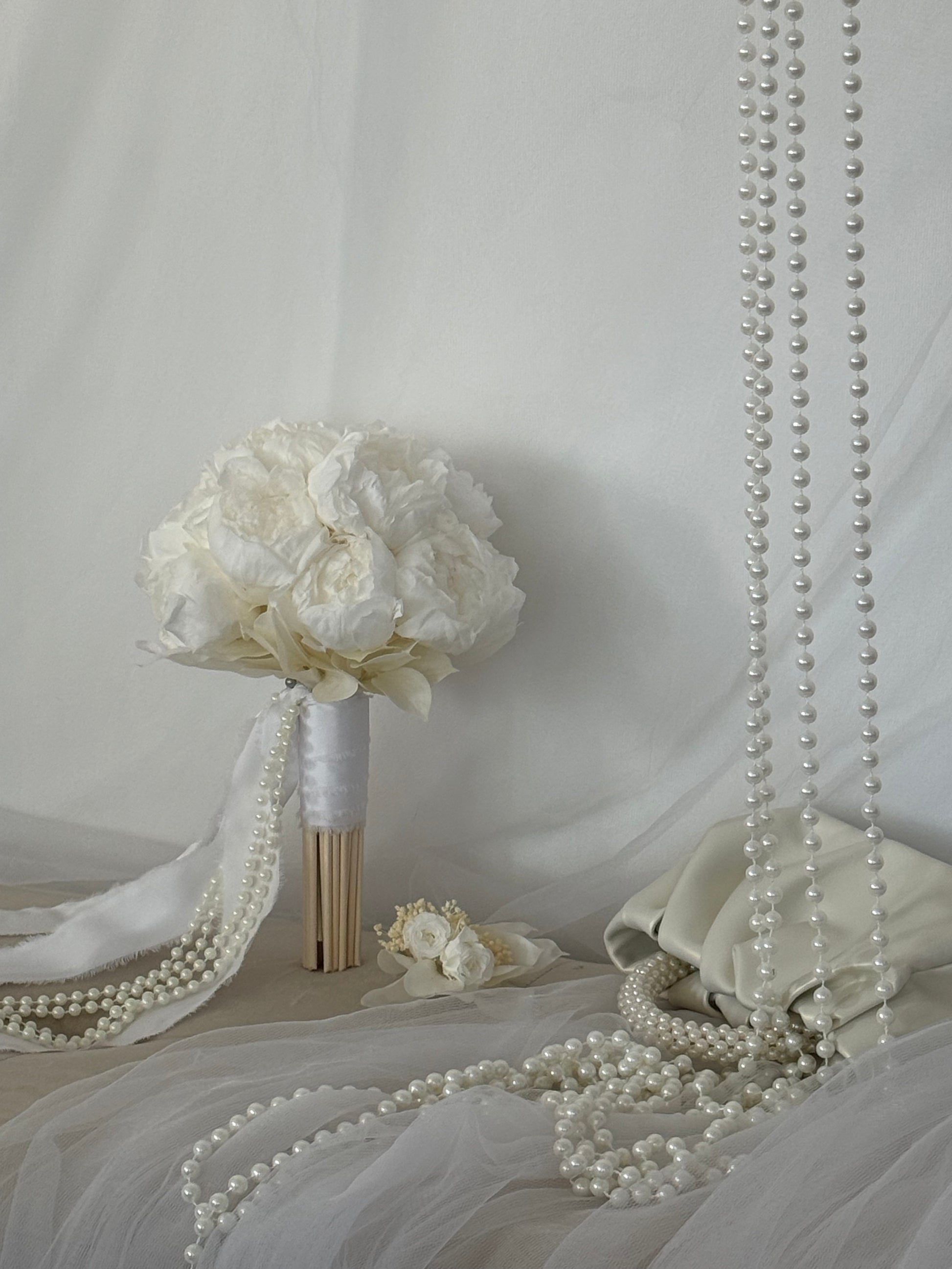Realza tu día especial con el ramo de novia Vargato. Con delicadas flores blancas y rosas , y un toque de eucalipto verde. Irradiando lujo y clase , este ramo añadirá un toque de prestigio a tu conjunto nupcial. Una elección elegante para la novia sofisticada.