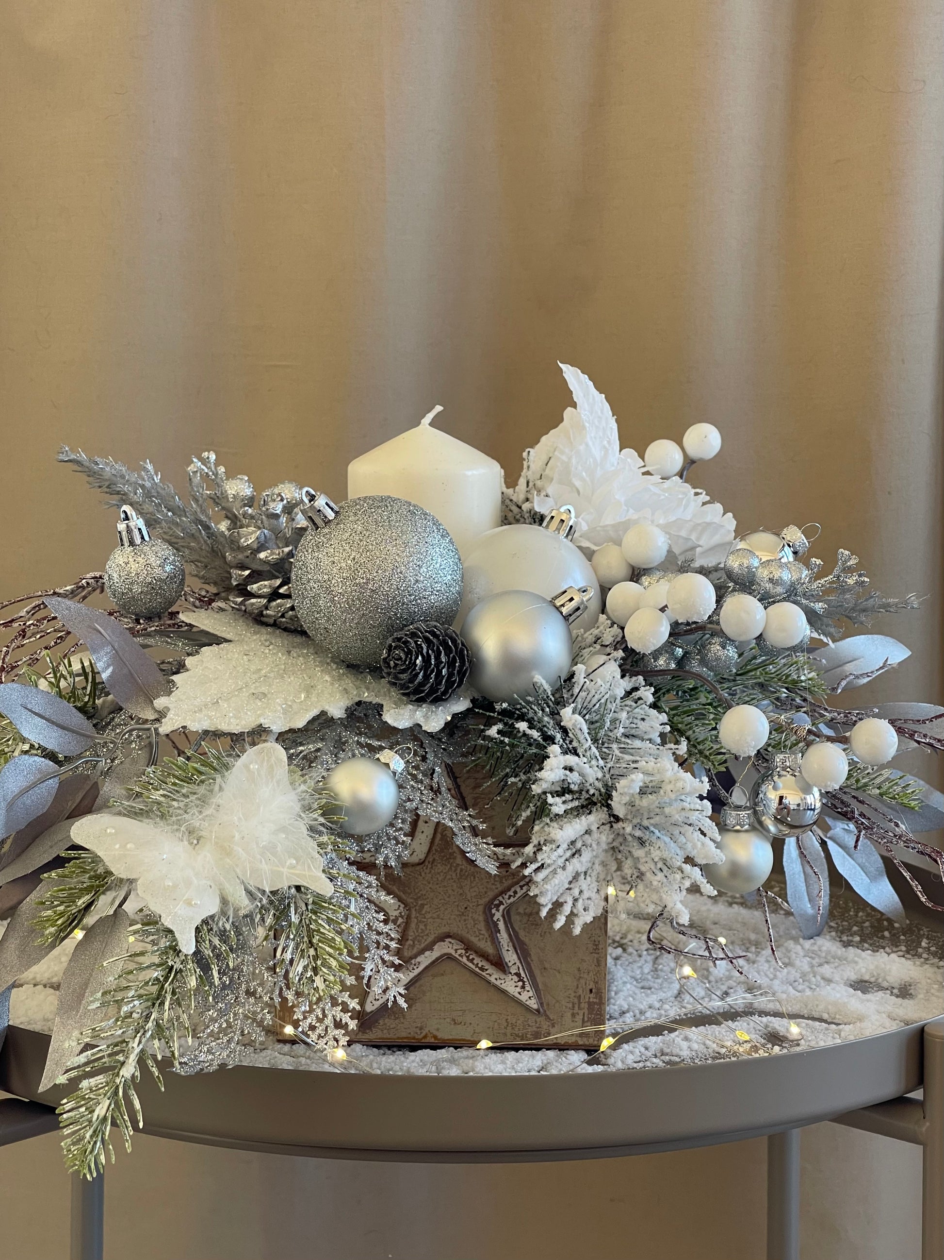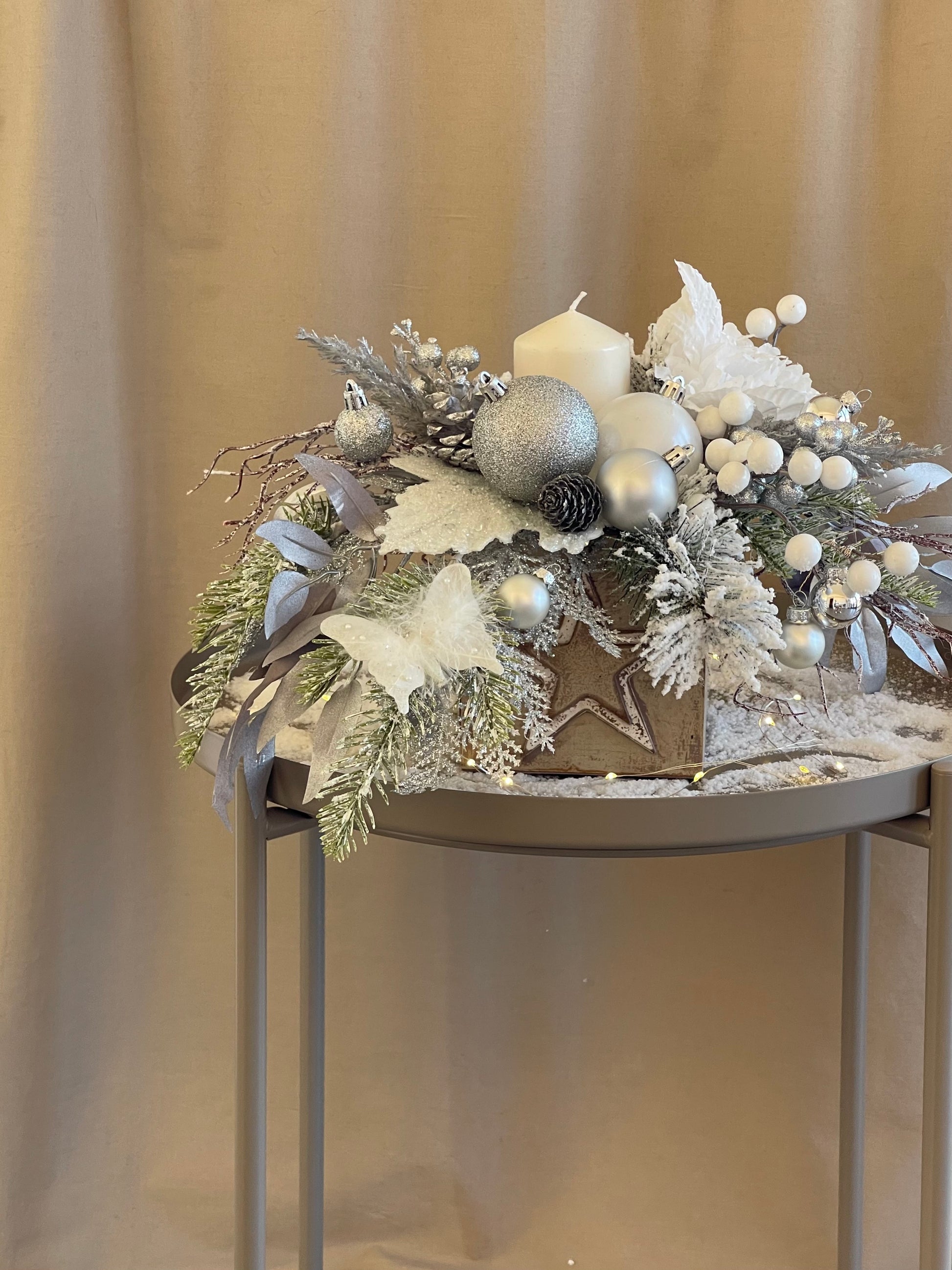Samantha, Silver Forrest fairy tale Christmas decor, New Year's decor. Christmas decor in a wooden box, with a candle, made of artificial materials, white, silver color bring Christmas feeling into every house. Gorgeous and versitile will serve for many years. Ideal for home, office decoration. Perfect gift idea for anyone!